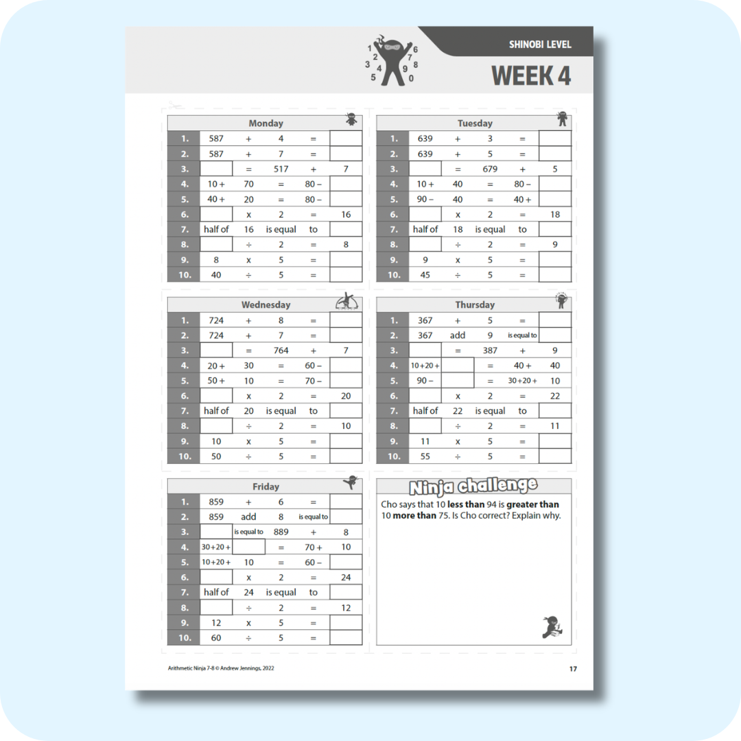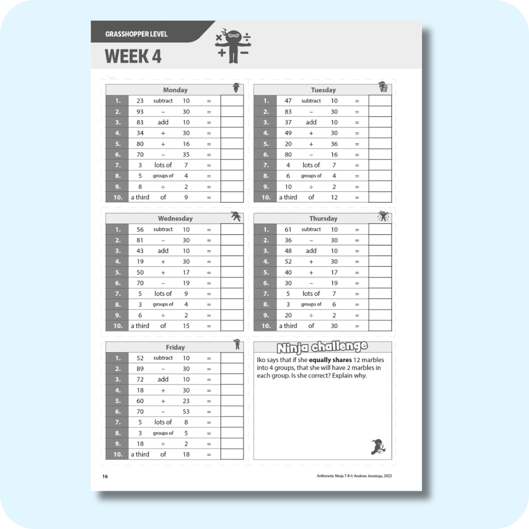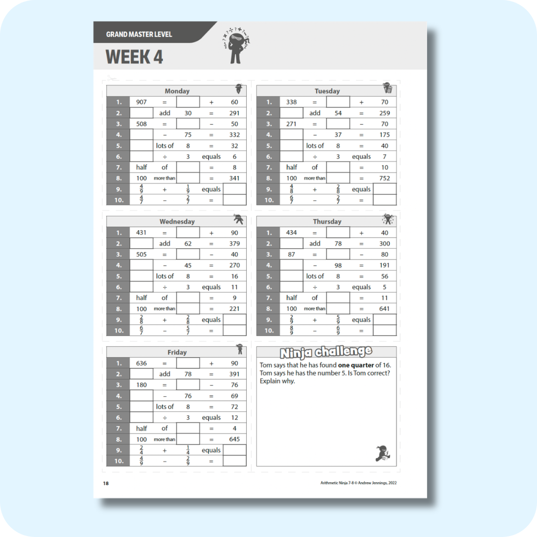The exercises in this book get progressively harder each week, and are divided into three Ninja levels to ensure differentiation. There are answers at the back to help with marking and cutting lines on each page so the activities can easily be cut out and stuck in exercise books.